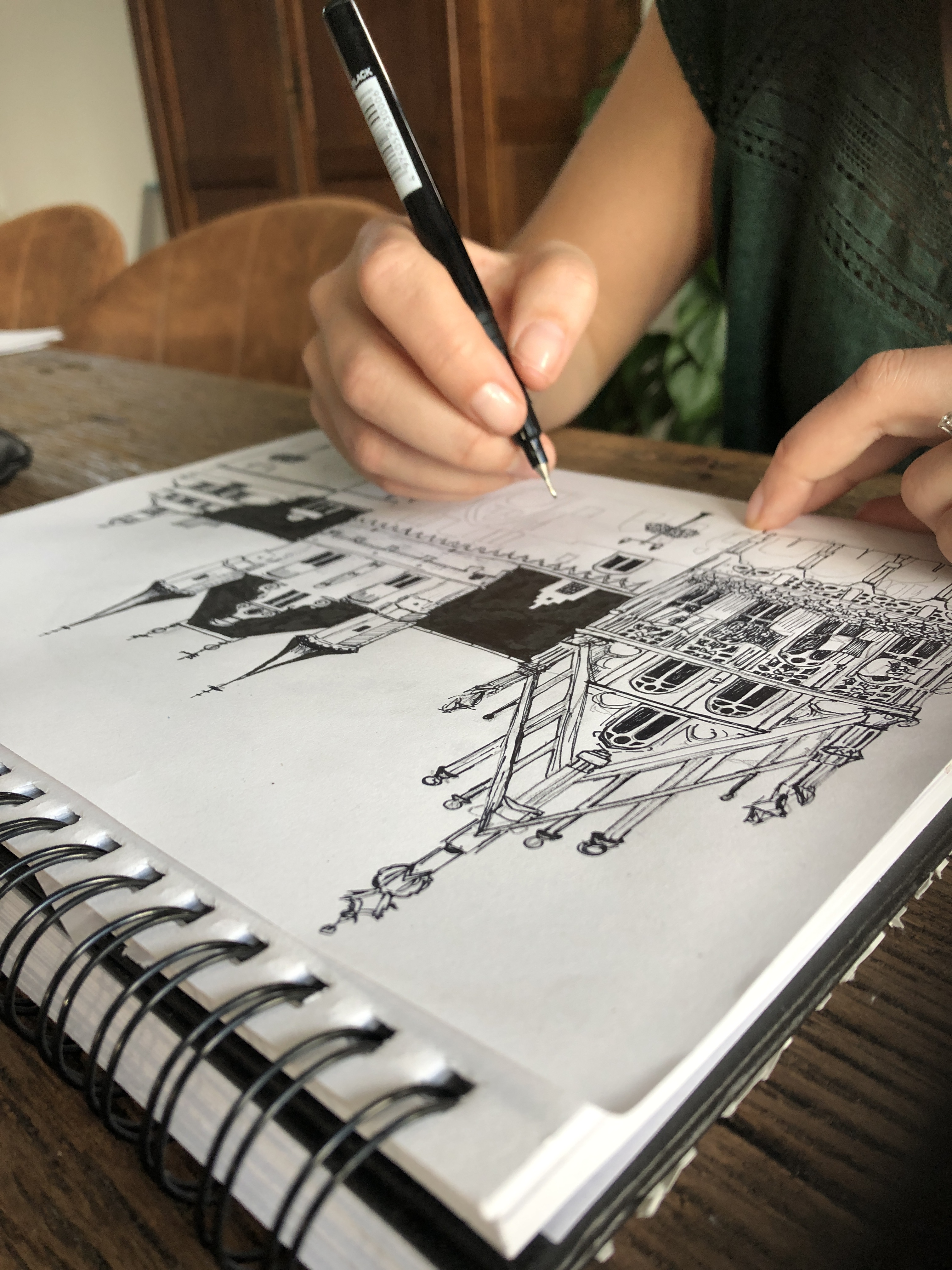 Het gebeurt dat ik buiten live teken, maar het liefst teken ik in mijn atelier naar (zelfgemaakte) foto’s. Na een eerste schets, teken ik alles met de hand in pen. Soms komt er ook nog digitale afwerking aan te pas. Het hangt ervan af waarvoor de tekening moet dienen en of en in welk formaat we eventueel gaan drukken.